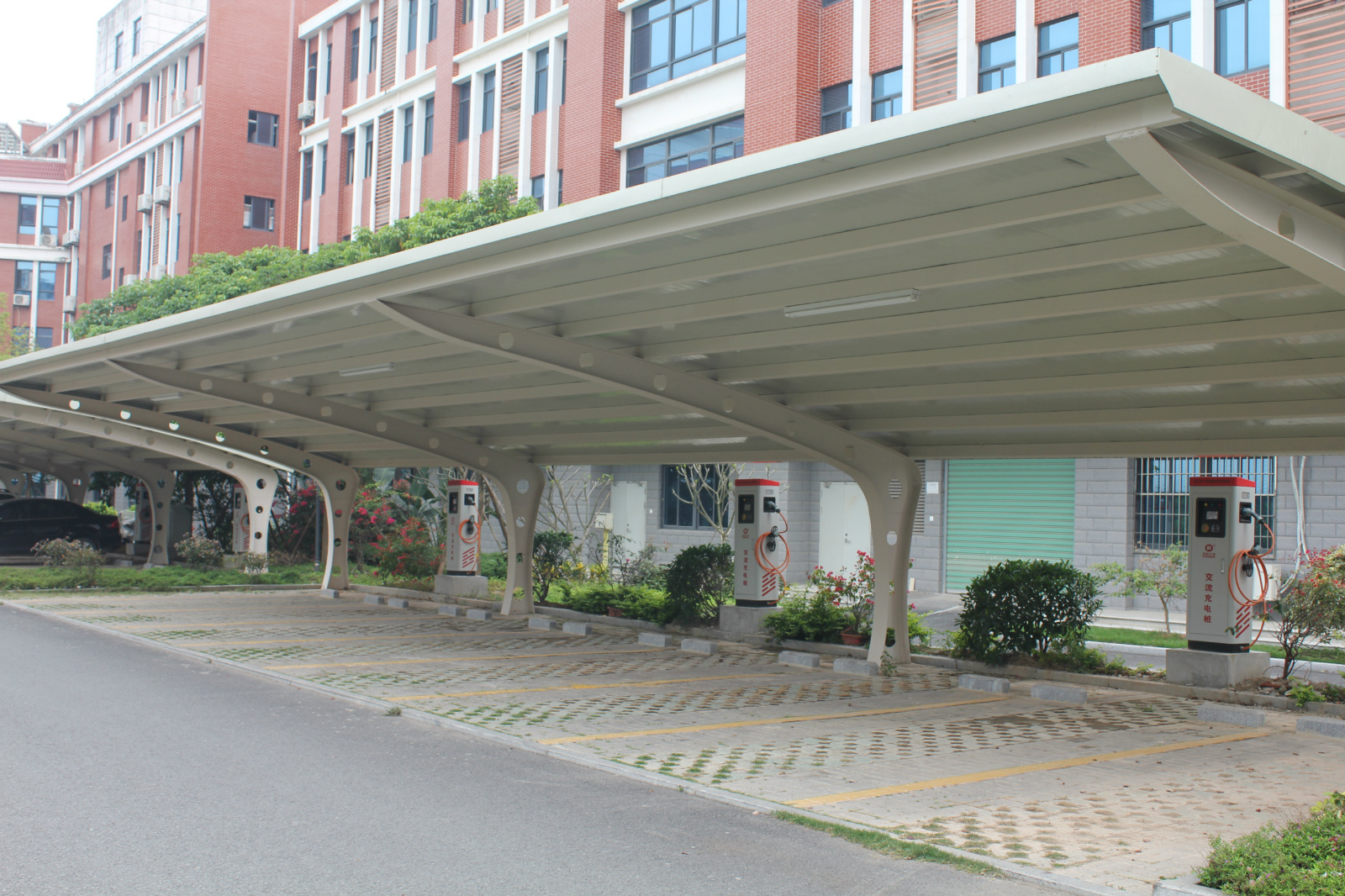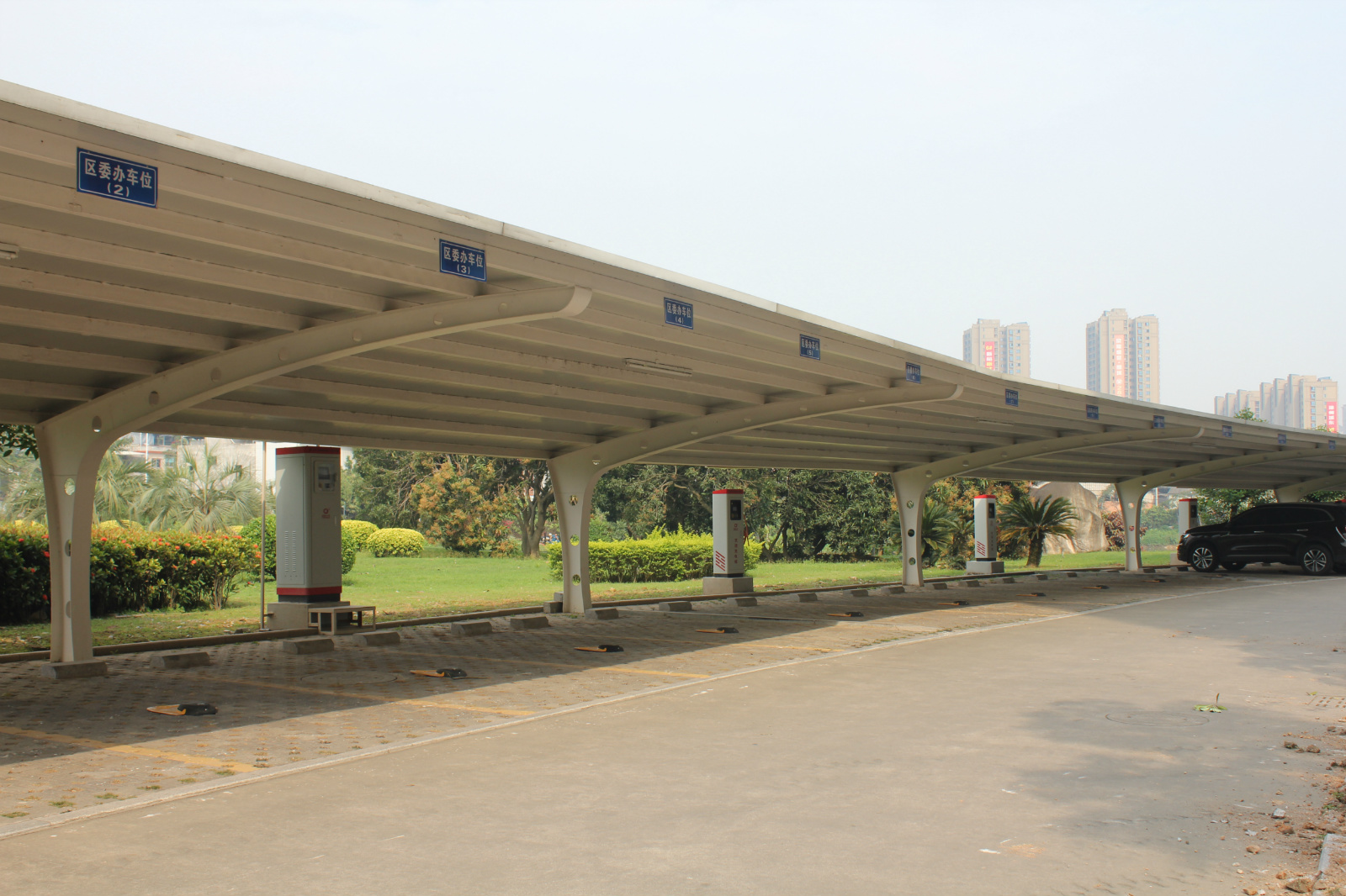 龙文区景山机关大院,目前已入驻交通局、计生局、气象局、审计局、环保局、城市管理行政执法局等多个行政部门单位,并与福建小葱智能科技有限公司合作,于停车棚设立6台30KW直流落地充电桩,14台7KW交流单相落地充电桩。市民在停车场可以通过手机安装APP进行扫描和使用专用磁卡的方式进行付费充电,为市民绿色出行提供服务。